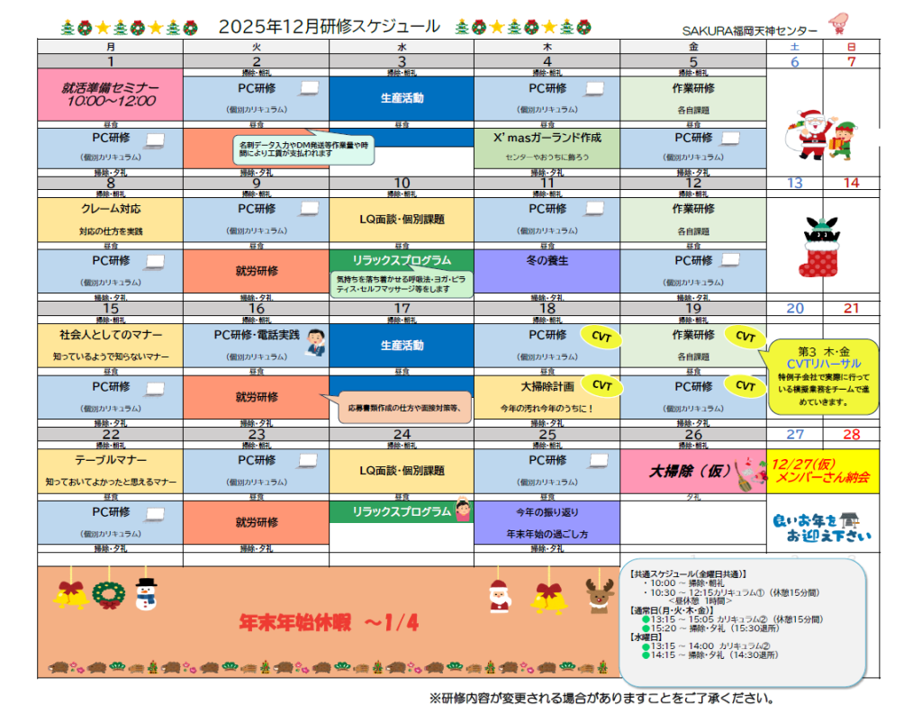 12月のセンター予定表は以下のカレンダーをご参照ください。