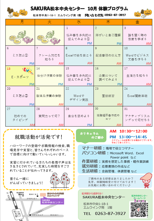 当センターが毎月発行しております、10月の体験カレンダーが完成しました!