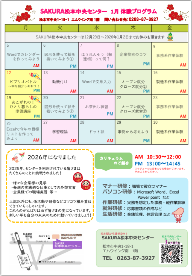 松本駅より徒歩4分!Mウィング内にあります、 就労移行支援事業所SAKURA松本中央センターの支援員です。