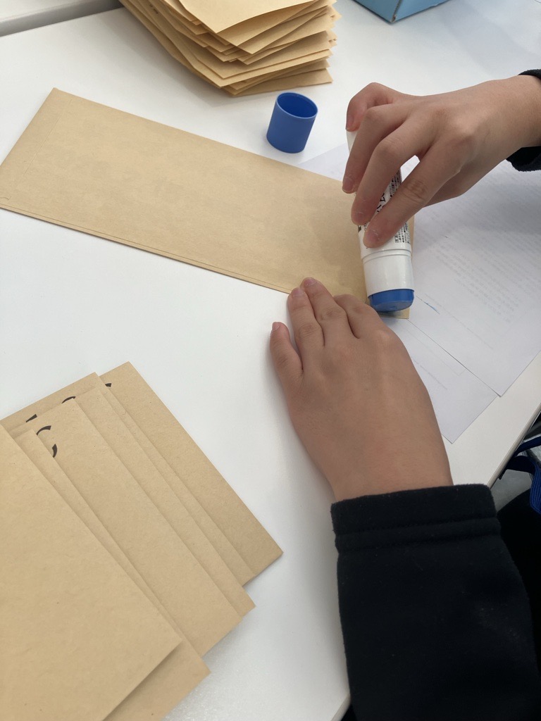 三つ折りされている郵送物を封筒に順番と向きを揃え入れ、丁寧に糊付けをしていきます。