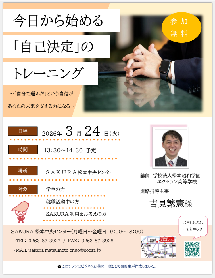 など、働くために自己決定は何故必要なのか、興味のある方ぜひご参加ください! 自己決定トレーニングの方法を分かりやすく楽しくお話いただけます♪
