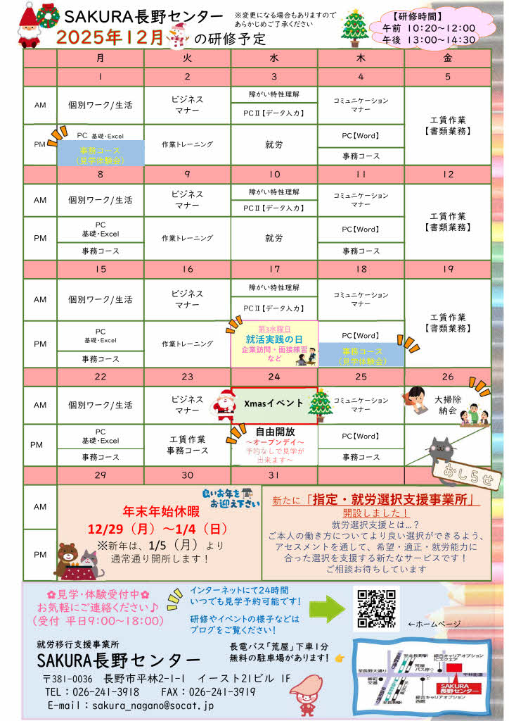 12月に入り街の空気も少しずつ年末のあわただしさを感じる頃となりました。SAKURA長野センターでは今月、なんと3名の利用者さんが就職を決められました!