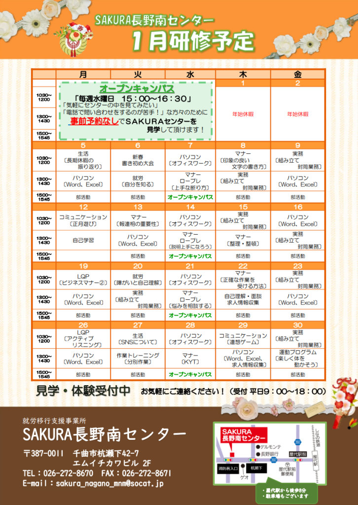 そして、1月の月間スケジュールも公開中です!興味のある研修やイベントがあれば、ぜひお気軽にお越しください。新しい一年を、仲間と一緒に楽しくスタートしましょう!