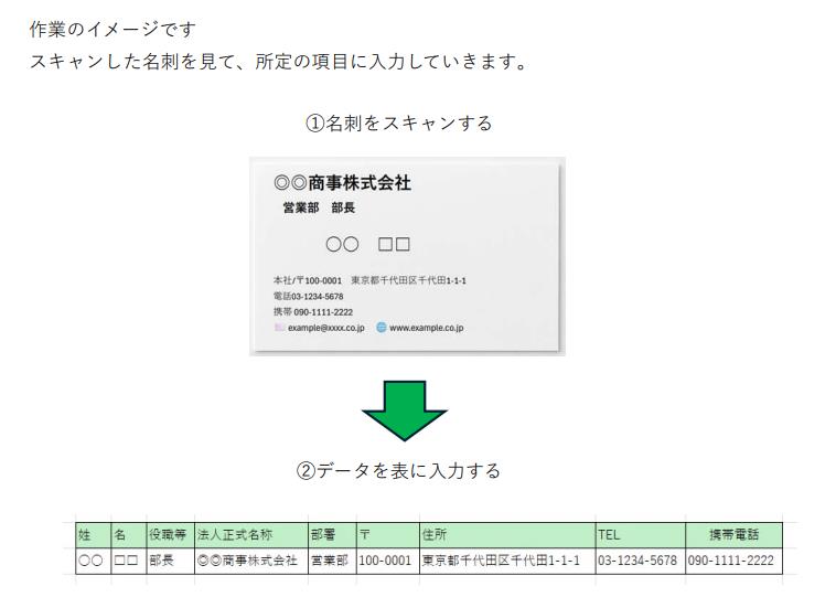 当センターにある実物の名刺をスキャンして、名刺の内容をExcelファイルにデータとして登録していただく作業です。