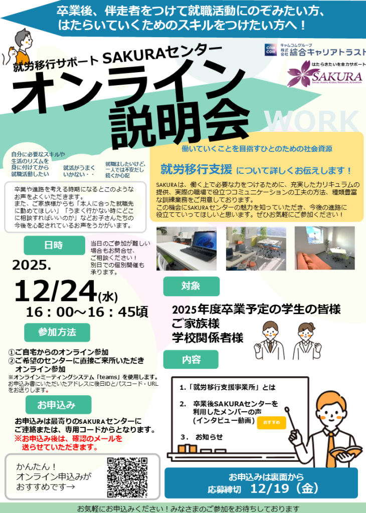 SAKURA富山センターでは、12月24日(水)16:00〜16:45頃まで、