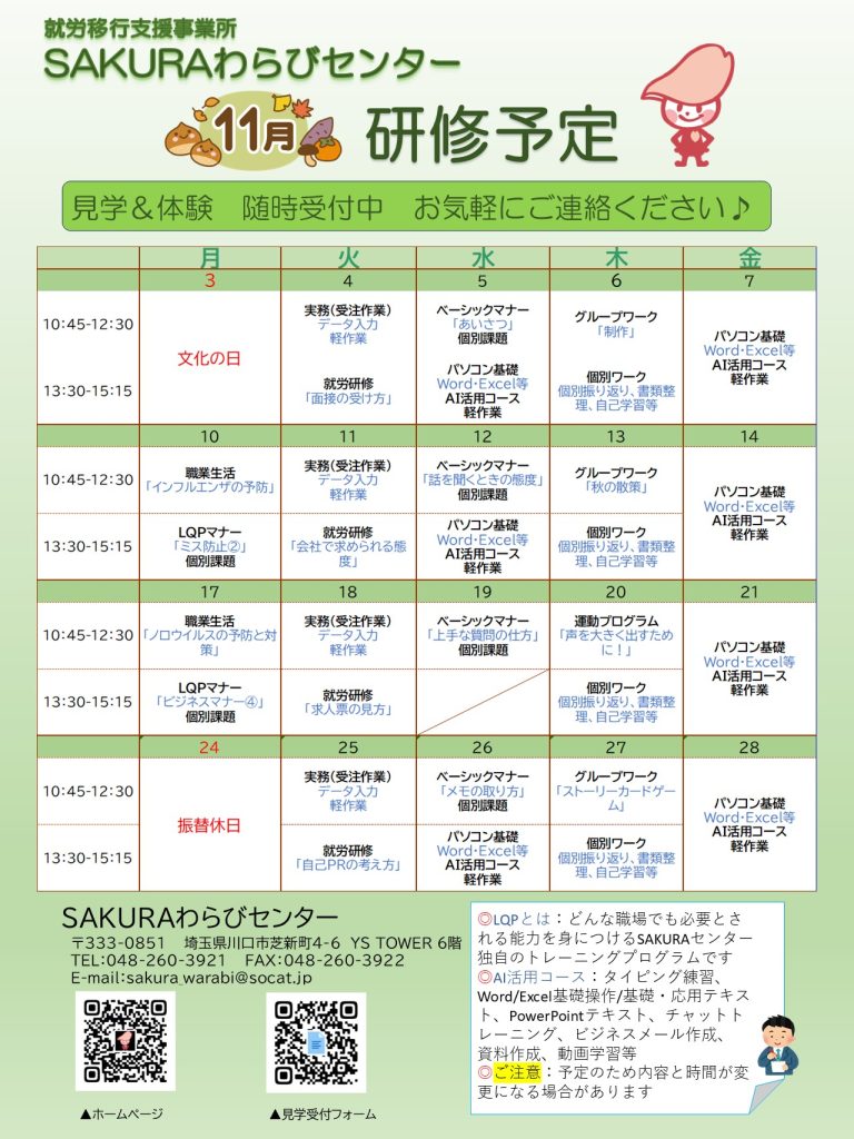 ▽本日はSAKURAわらびセンター11月カリキュラムのお知らせです▽